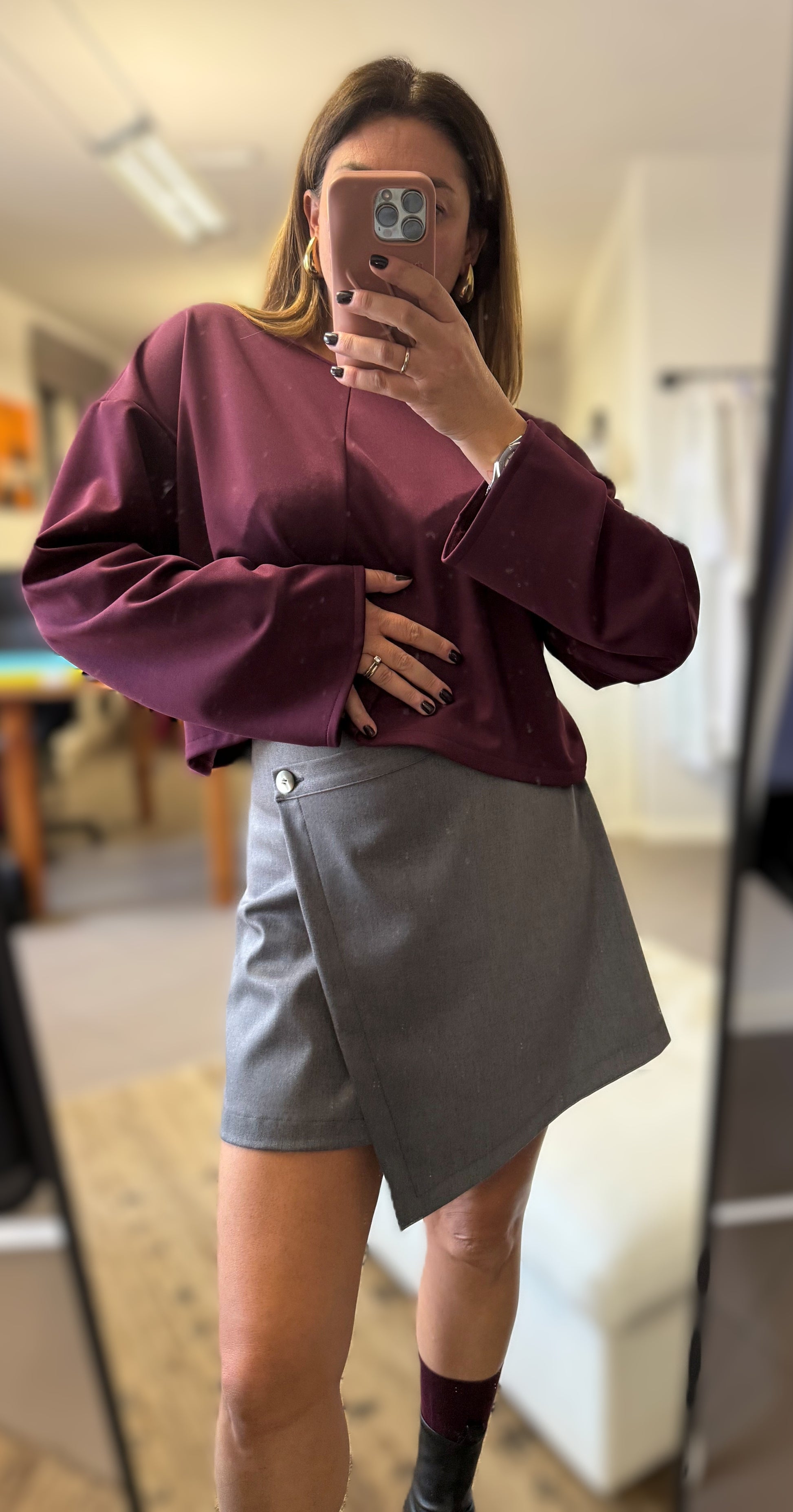 Gonna mini asimetrica, con bottone e cerniera